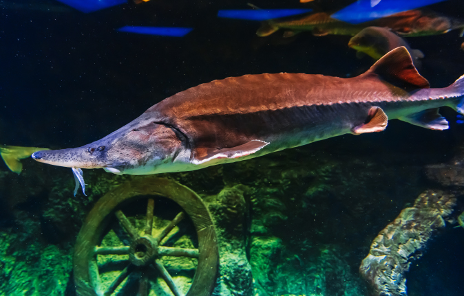 Je vhodný pro větší zahradní jezírka, jde o velice zvláštní a svým vzhledem připomínající prehistorickou rybu. Barvu má našedlou, nahnědlou či nazelenalou. Snese se s koi kaprem nebo také s karasem. Kvalitní filtrace a vzduchování je zásadní. Mladí jeseteři, jsou zprvu dosti neohrabaní a mohou uvíznout v rostlinách či řasách. Jeseter se dožívá až 15 let a dorůstá se délky dle druhu až 125 cm. Jeseter se živí bezobratlými živočichy ze dna larvami hmyzu, korýši, červy navíc občas i drobnými rybkami. Přírodní potravy v jezírku pro ně není většinou dostatek a proto je potřeba je převést na granulované krmivo. Potravu jeseter sbírá ze dna proto používáme potápivé krmivo. Jen pozor, pokud je budete chovat s koi kapry, tak je potřeba nejprve nakrmit koi kapry a poté jesetery, protože koi kaprům krmivo pro jesetery chutná a mladí jeseteři by se ke krmivu nemuseli vůbec dostat.